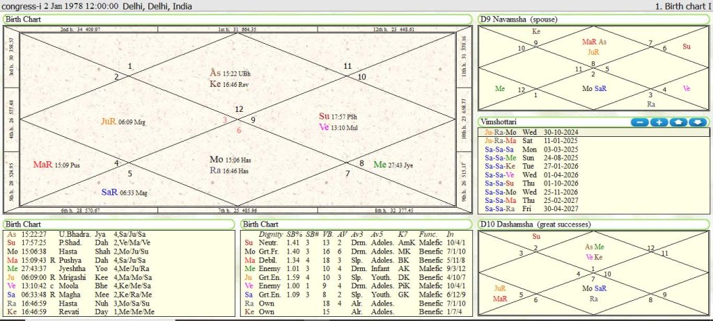 Mahadasha of Jupiter:Jupiter Mahadasha lord in posited in 4th house as lagna and 10th lord. Jupiter has aspect of Sun 6th lord and Venus 3rd and 8th lord. This aspect of 6th and 7th lord on Mahadasha lord Jupiter is not good. Jupiter in the navamsha d-9 chart is placed in lagna. It is conjunct with retro Mars while being aspect by Moon and retro Saturn from the 7th house of opposition. Congress-I is entering Saturn Mahadasha from 3-3-2025. This is very ominous Mahadasha for Congress-I.