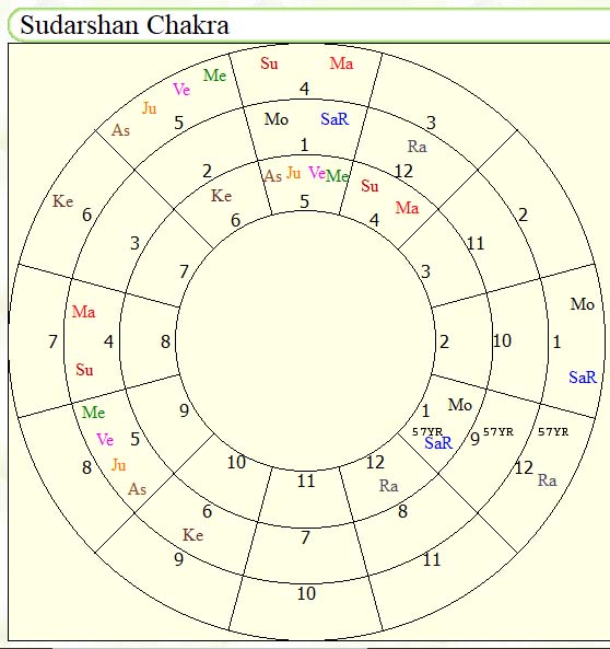 [Sudershan chakra work in very simple manner. First year represent fist house ,second year represent second house so on keep on counting up to twelfth house .Then thirteen year comes to lagna fourteen year comes to second house and twenty forth comes to twelfth house .Twenty fifth year again lagna like this keep on progressing ]
