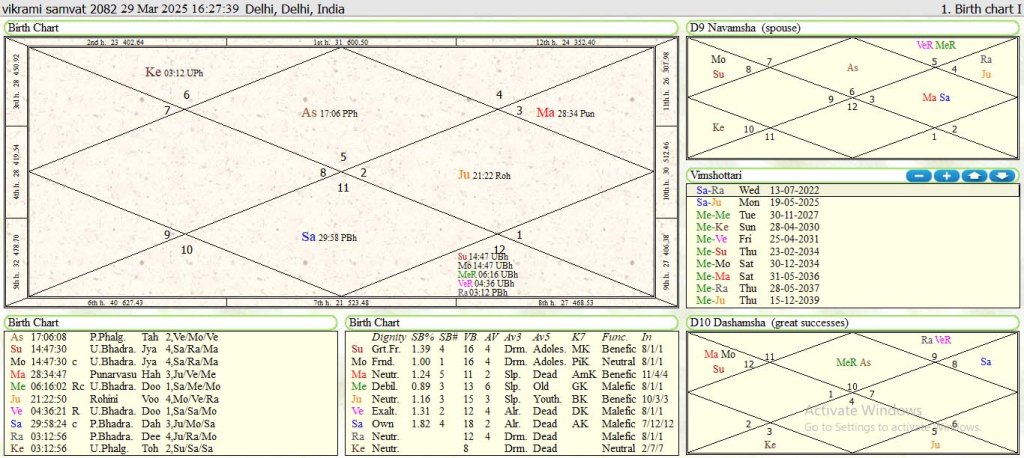 Tenth house :Tenth house in vikrami samvat 2082 represent house of king, chief executive ,prime minister, nobility, national honor etc.Tenth house contain Taurus sign its lord Venus posited in 8th house exchange with 8th lord Jupiter.10th lord in 8th house indicates many secret works. The king does these secretly to save the nation from anti-national forces.8th lord in tenth house indicate change in portfolio in cabinet of PM Narendra Modi.His enemy will try to harm him but he will survive due to lot of benefic in 8th house with 10th lord Venus.10th house has first rate benefic Jupiter which 5th lord also. In navamsha d-9 chart, Saturn and Mars conjunct in the 10th house. This conjunction indicates harsh decisions by PM Narendra Modi. These are taken to deal with anti-national forces in India. Tenth lord in 12th house in Navamsha d-9 chart indicate increase of influence of PM Narendra Modi outside India. What ever anti Modi astrologer may predict fall of PM Narendra Modi but he will complete his full five year term upto 2029 in India at centre .