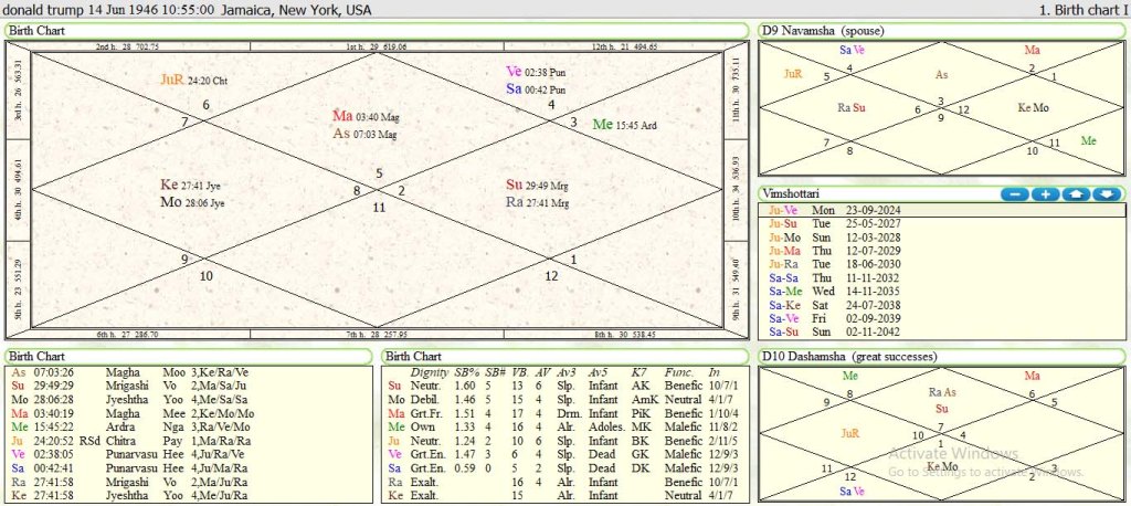 - He is undergoing Jupiter–Venus dasha (23 Sept 2024 – 25 May 2027), with Venus conjunct Saturn (6th and 7th lord) in the 12th house—pointing to foreign war involvement, especially by sea, with China and Iran.