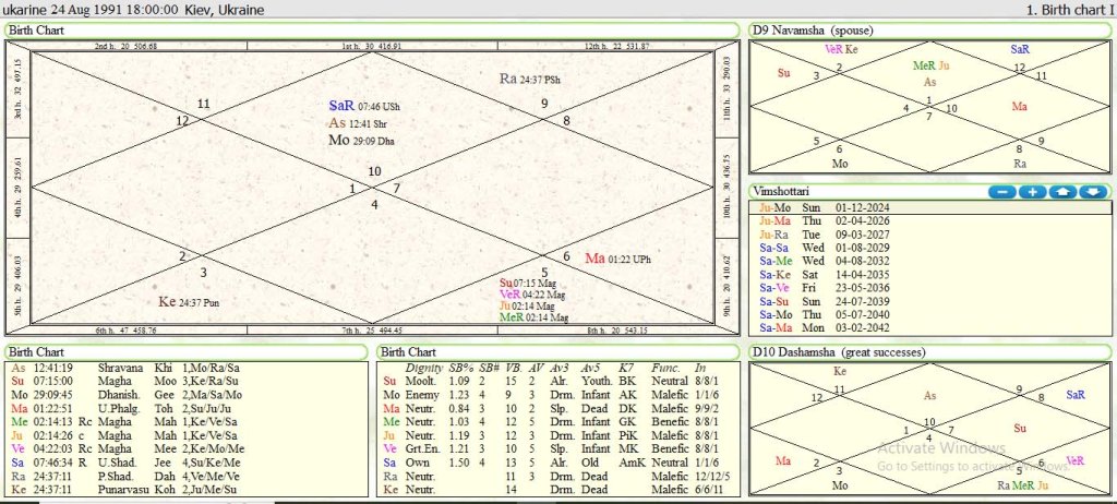 - Currently under Rahu–Venus Dasha (8 Jul 2024 – 8 Jul 2027), with Rahu in the 7th house of open war and Venus in the 5th.