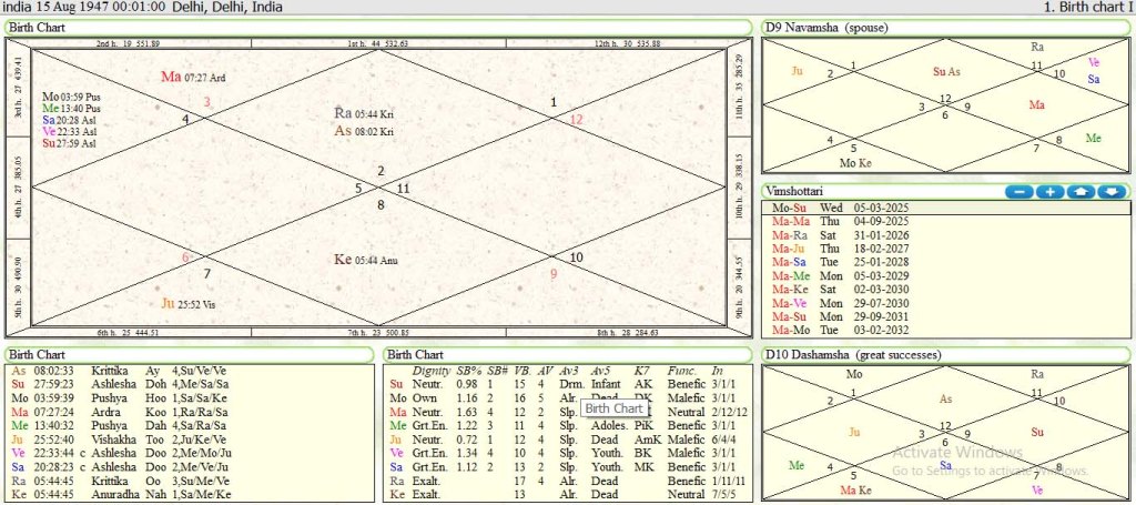 Currently, India is undergoing Moon-Sun dasha (from 5 March to 4 September 2025). Moon, the 3rd house lord, has supported communication and central political leadership. However, its placement in the 6th house of the D-9 Navamsa chart, conjunct with Ketu, points to potential conflict with neighboring nations: Pakistan, Bangladesh, and China.