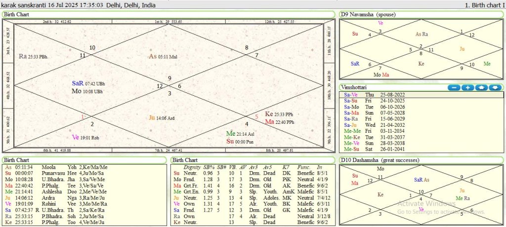 - Cancer Sankranti (16 July 2025): Rising Sagittarius with afflicted 4th house (Saturn + Moon) suggests disruption in domestic peace.