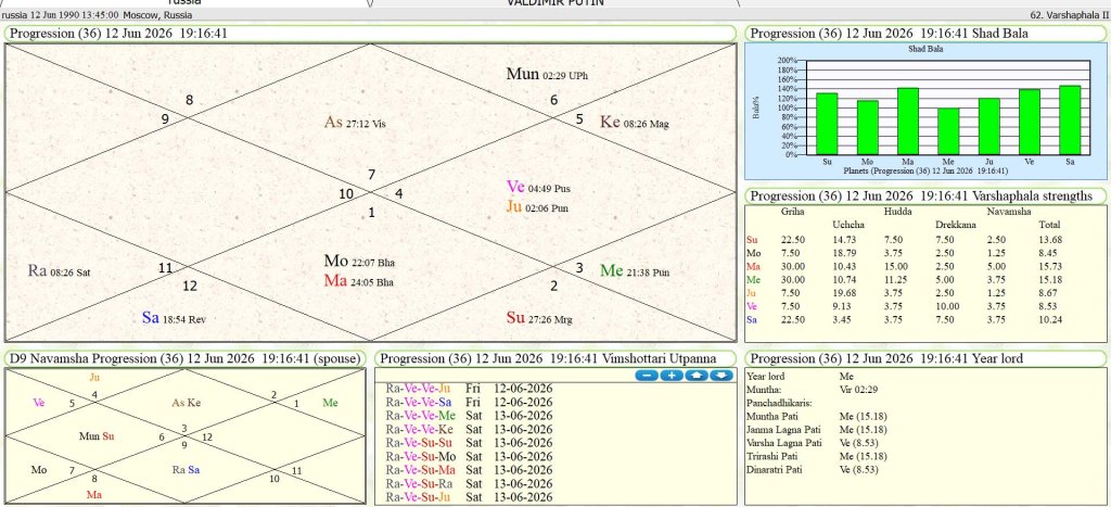 Despite the 12th house progression in Sudarshan Chakra, the Varshphal is highly supportive of Russia’s military campaigns and territorial ambitions—likely pushing the war beyond Ukraine.