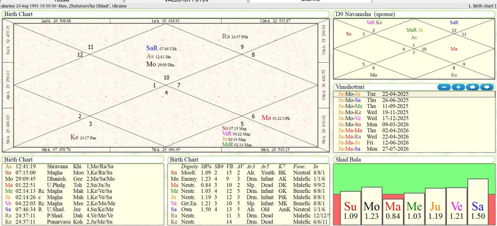 - Moon (7th lord of war) conjunct Saturn in Lagna—critical phase for Ukrainian leadership.