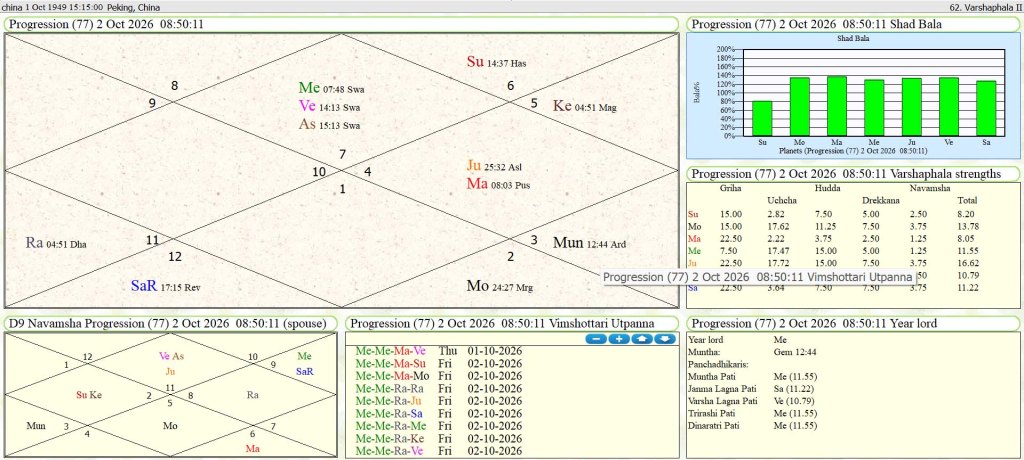 The future of China appears turbulent, and through careful analysis of its transits, 76th and 77th ,78th Varshphal, and Sudershan Chakra progression for the 77th year, we explore China’s potential geopolitical and economic path. Given China’s status as a core component of India’s 3.5-front threat (China, Pakistan, Bangladesh, internal unrest), this analysis is of particular significance.