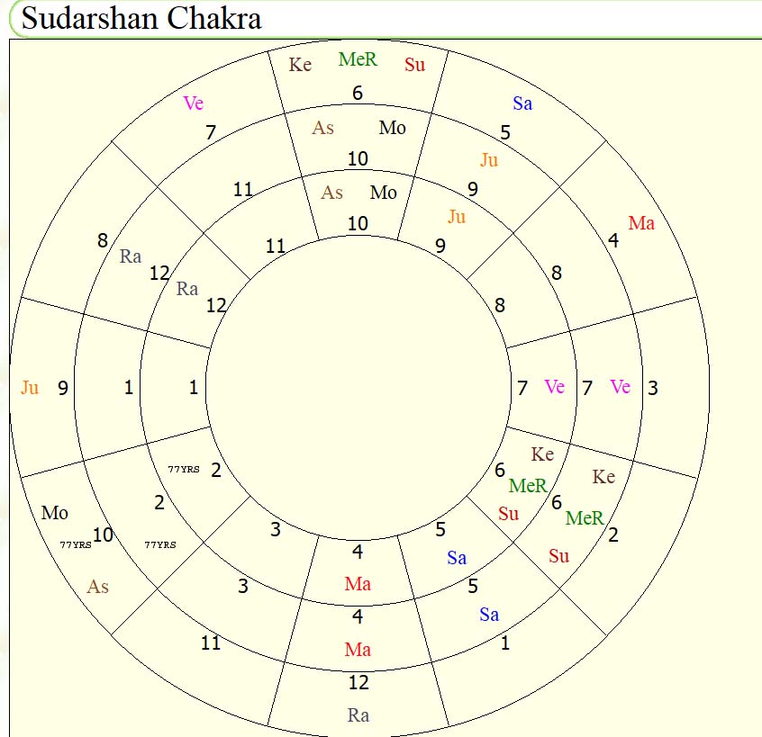 [Sudershan chakra in very simple manner. First year represent fist house ,second year represent second house so on keep on counting up to twelfth house .Then thirteen year comes to lagna fourteen year comes to second house and twenty forth comes to twelfth house .Twenty fifth year again lagna like this keep on progressing ]