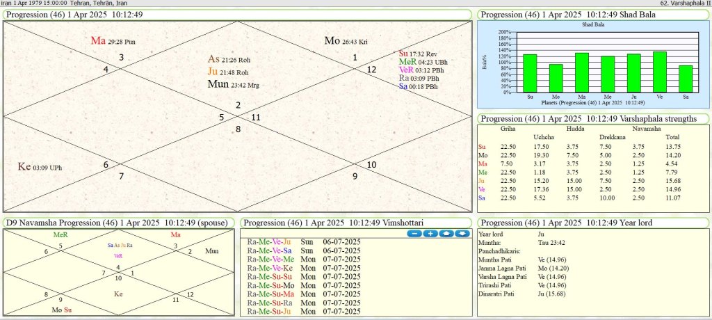 - Jupiter aspects Mars, retrograde Mercury, and Sun in the 9th house—triggering external attacks (e.g., from Israel/US) during the Mars Antardasha, which ends on 10 June 2025.