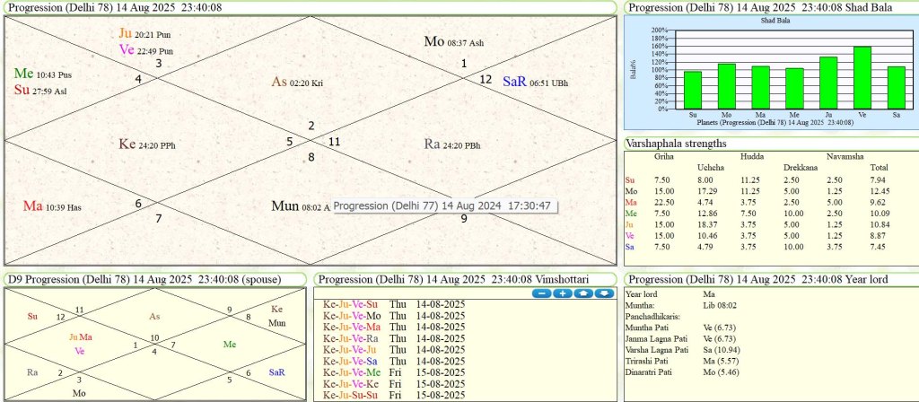 India’s 79th Varshphal begins on 14 August 2025 at 23:40 hrs, Delhi, with Taurus Lagna—a Dwi-Janma Lagna year (same as natal chart), amplifying its karmic significance.