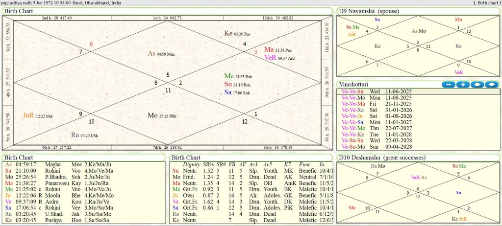 CM Yogi Adityanath’s 54th Varshphal began on 6 June 2025 at 00:56 AM (Pauri, Uttarakhand) with Aquarius Lagna rising. This year’s chart indicates both challenges and opportunities, especially in political and ideological spheres. Let’s explore the major planetary placements and periods in detail.