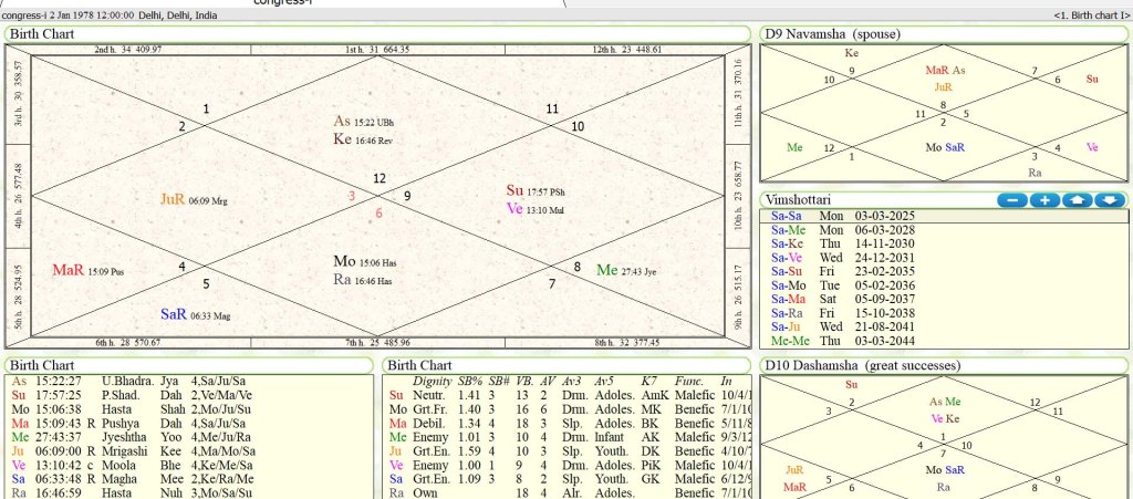 - In Navamsha: Mars retro with Jupiter in Lagna, opposed by Saturn → not good for younger Congress leaders but ensures aggressive politics.