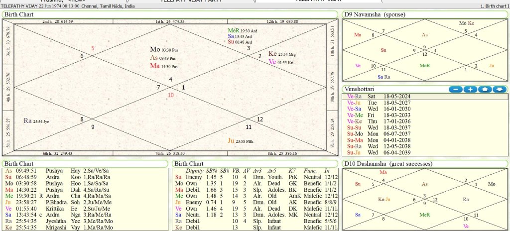Although I usually do not write about film personalities, the entry of South Indian superstar Joseph Vijay Chandrasekhar into politics has drawn my astrological attention. His transition from cinema to politics marks a major event in Tamil Nadu’s political landscape. The horoscope shared by a friend provides deep insight into his political potential and the destiny of his new party.