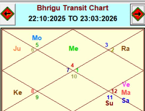 In this Bhrigu transit cycle, the 10th lord Mars is positioned in the 8th house, while the Lagna lord Moon is in the 2nd house, aspected by Mars. The Sun also occupies the 8th house.