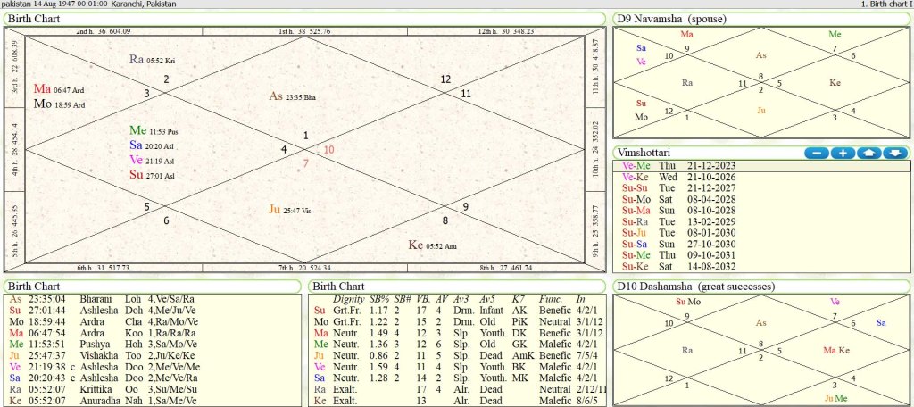 Birth Data: 14 August 1947, 00:01 hrs, Karachi, Pakistan