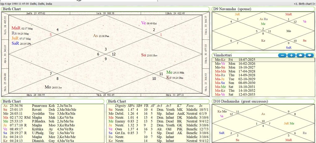 - In D-10, Venus with Moon and Ketu under Mars’ aspect indicates organizational strain, internal controversies, but also a possible breakthrough in Bengal against Mamata Banerjee due to Venus’s mass-appeal traits.