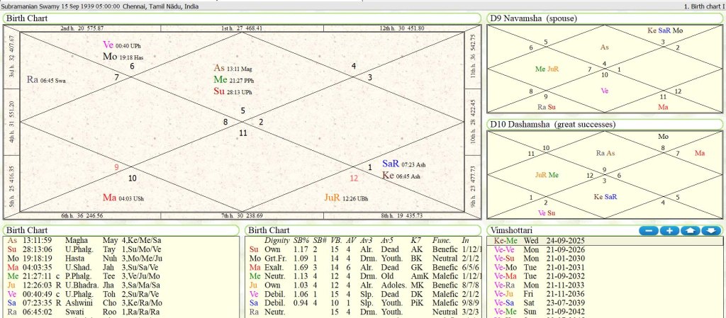 Astrologically, Subramanian Swamy’s chart indicates a fearless political critic with strong intellectual and argumentative abilities. His planetary combinations favor confrontation with powerful figures and the exposure of controversial issues.