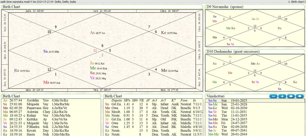 The oath-taking chart of the Narendra Modi government on 9 June 2024 at 7:23 PM in Delhi rises with Scorpio Lagna.
